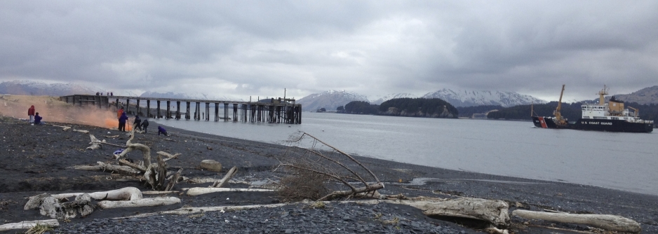 KISAR member directs school children in the use of orange smoke flares, as the USCG cutter Spar passes nearby.