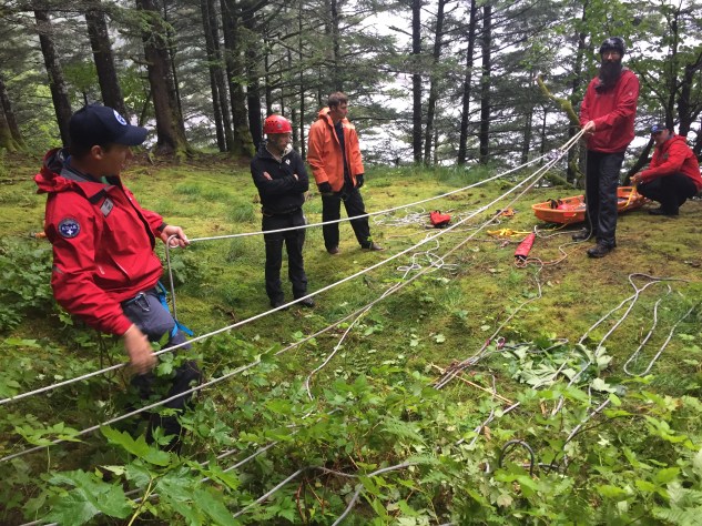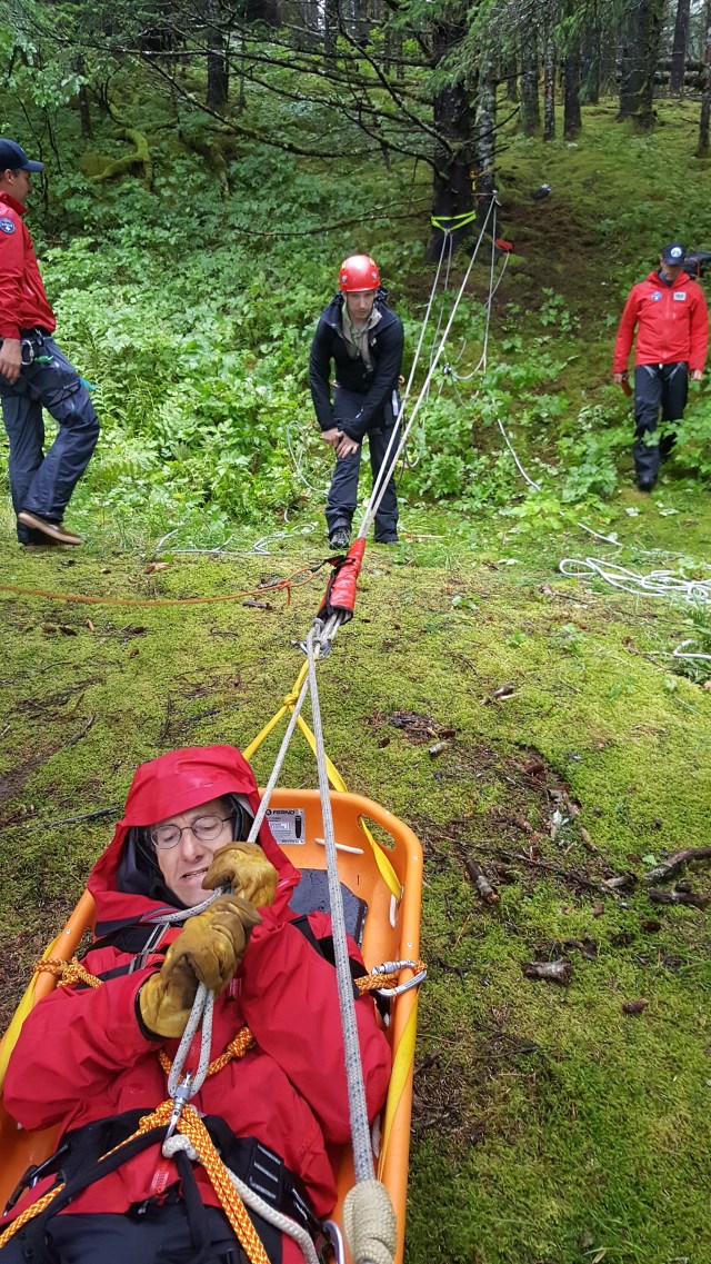 John Sikes led KISAR members through high angle lowering and raising of a litter. Members set up a main line and a belay line, packaged Dicky in the litter and lowered him with an attendant. Then members set up a 5 to 1 system for raising the litter back up. Focus was on new techniques John had learned and team communication during an event.