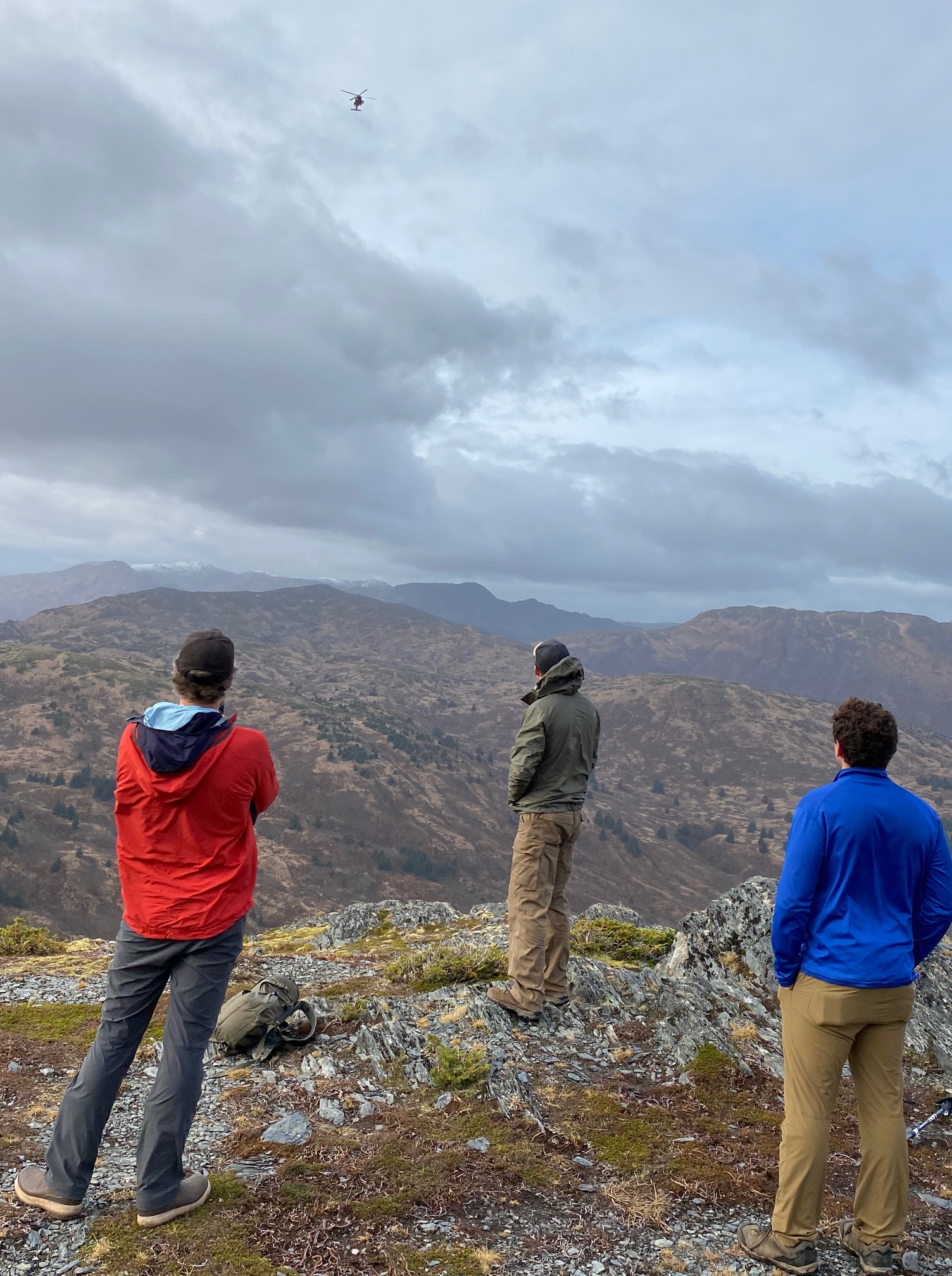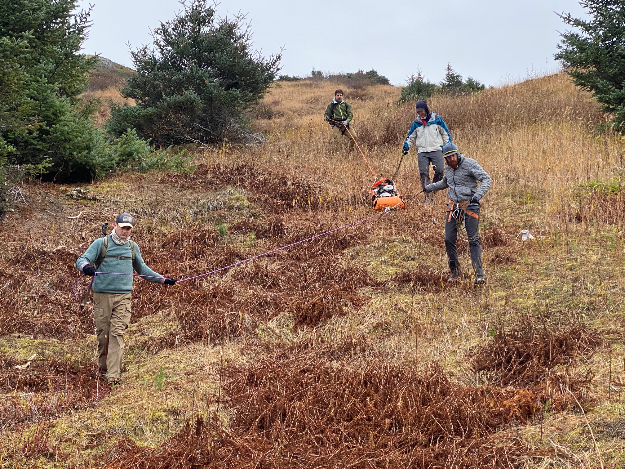 KISAR members met at the Pyramid Mountain parking area at 10 am and hiked up to top of Jibber Bowl at about 1500’. They assembled the SKED litter and then belayed a simulated patient down with a harness-mounted belay device and occasionally off to alder anchors. The training started in the alpine on steeper ground where the braking was more of a challenge. A USCG helicopter visited the training area and KISAR members practiced vectoring the aircraft to their location via commands over radios.