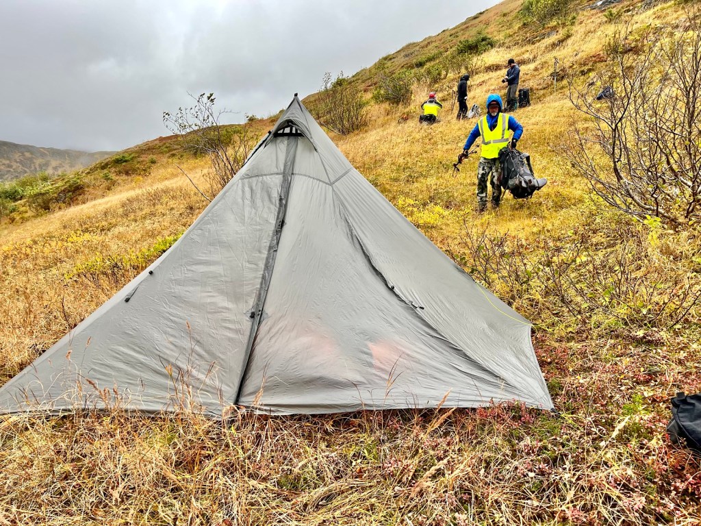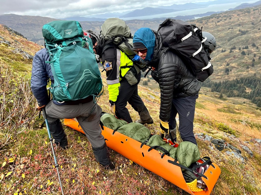 For KISAR’s October training we were invited to participate in an inland SAR training exercise with the USCG Air Station and the Royal Canadian Air Force. The Canadian’s CH-149 Cormorant had mechanical issues and did not make it to Kodiak, but KISAR and the USCG were able to do litter hoist reps using both MH-60 and MH-65 helicopters to close out the exercise. Prior to the helo portion, KISAR members performed a mock call-out for a lost and injured hunter located somewhere on the north side of Pyramid Mountain. Members mustered in the Pyramid Mtn parking lot at 1100 and then deployed up Pyramid to perform an area search for a responsive but immobile subject using a critical separation line-abreast sweep search. After the subject was located, KISAR members provided medical care including a patient assessment, stabilizing the lower extremity injury in an improvised leg splint, and securing the patient with a climbing harness anchored to KISAR’s SKED litter. We set up a floorless pyramid shelter to protect the patient while waiting for verification of a helicopter response, and then carried the patient higher on the mountain to a more suitable extraction point. Litter hoist reps were then performed by both MH-60 and -65 aircraft, after which KISAR members descended back to the parking area and demobilized.