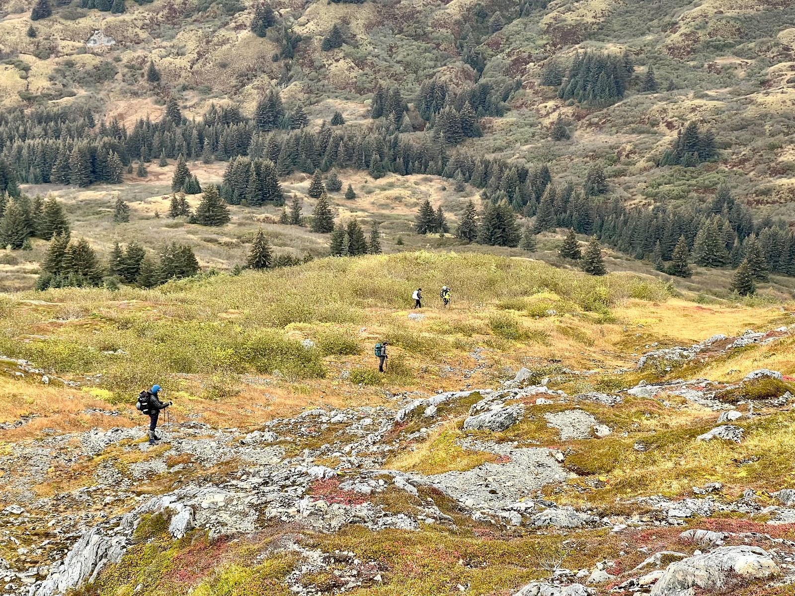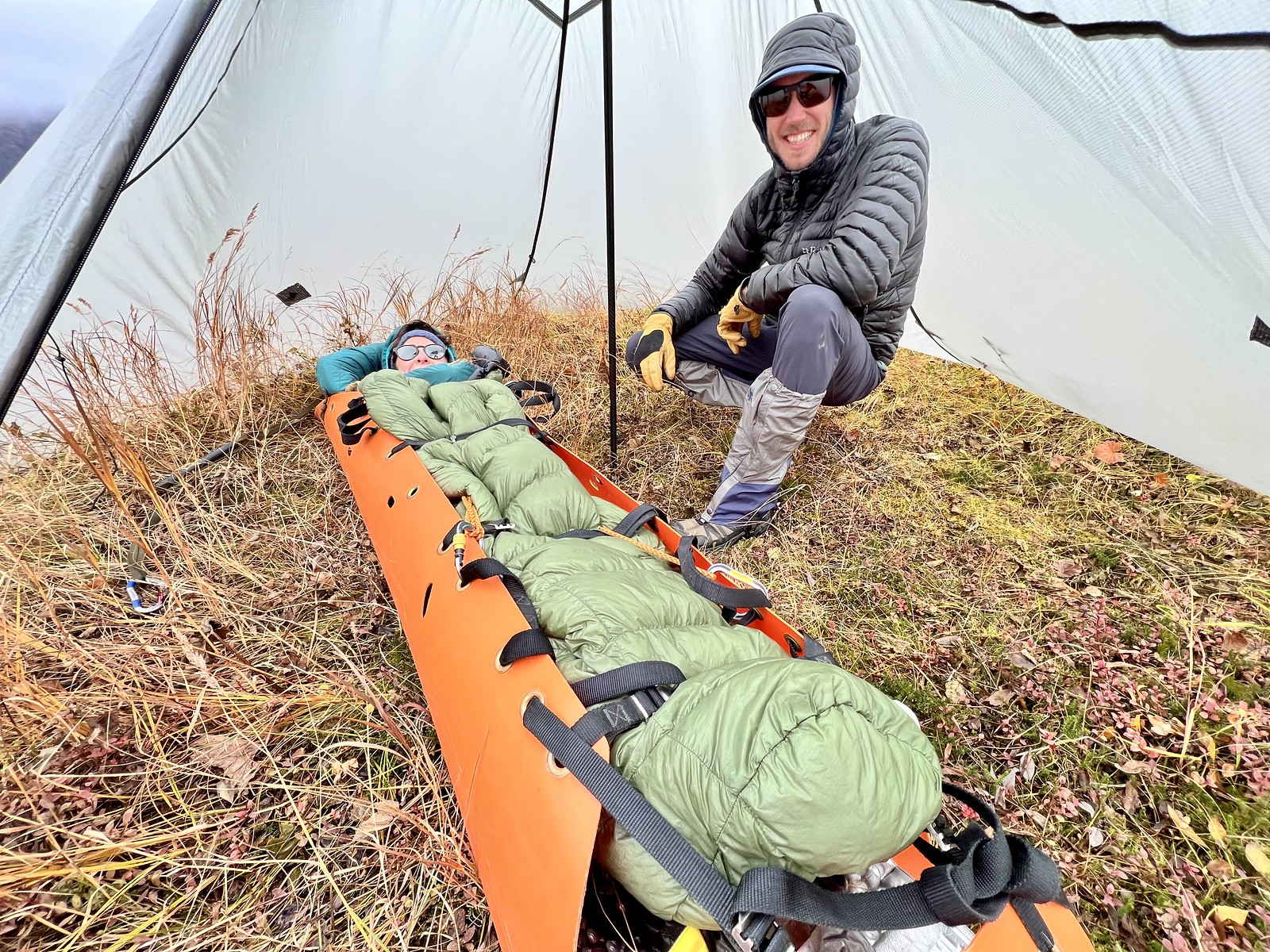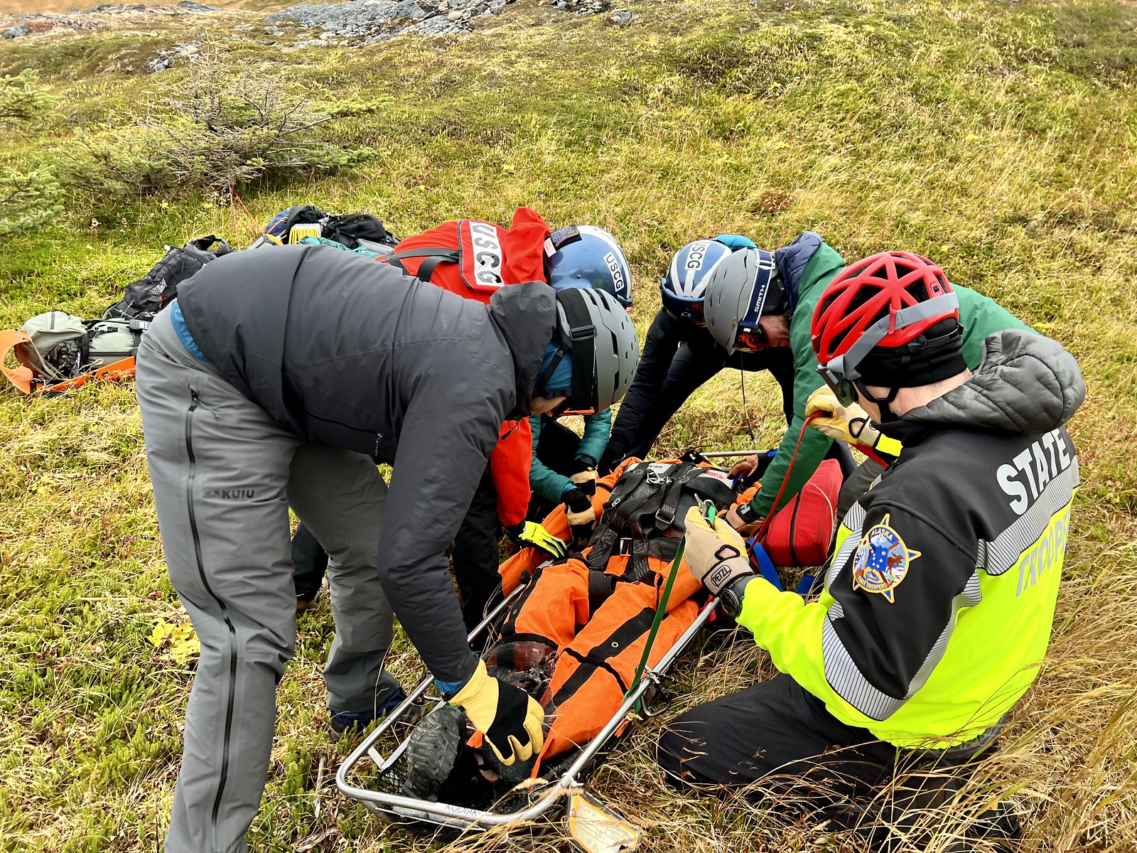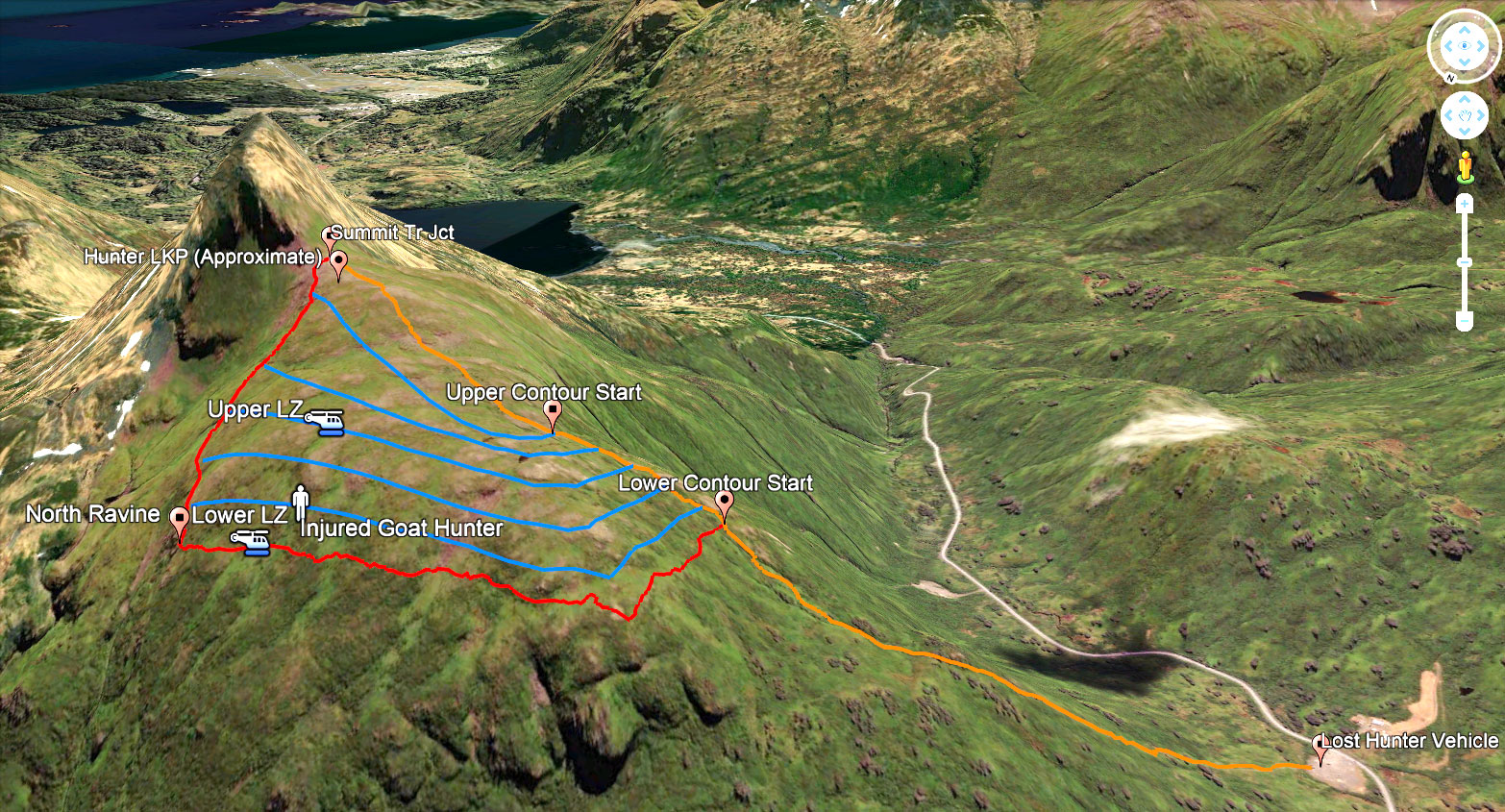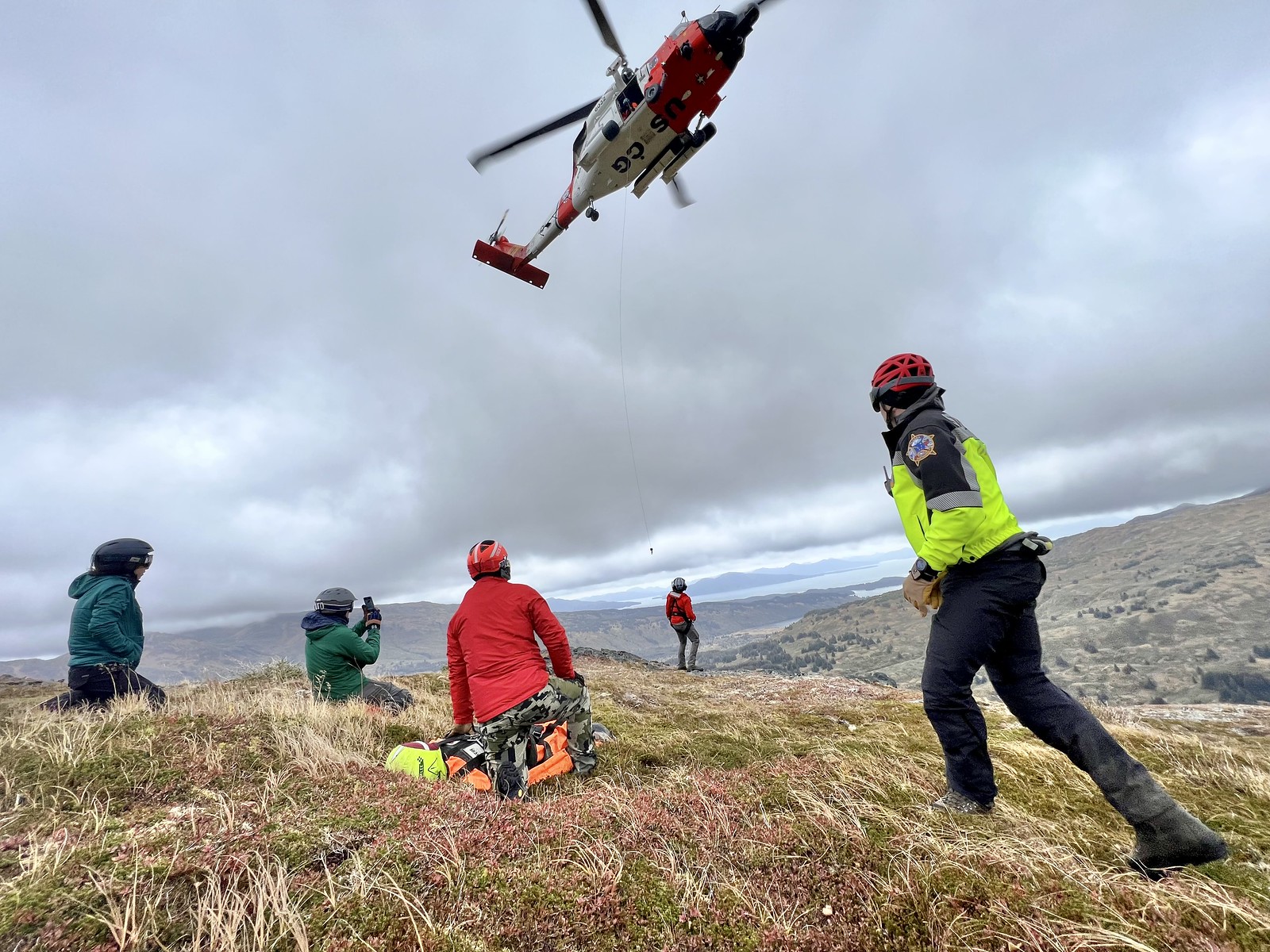 For KISAR’s October training we were invited to participate in an inland SAR training exercise with the USCG Air Station and the Royal Canadian Air Force. The Canadian’s CH-149 Cormorant had mechanical issues and did not make it to Kodiak, but KISAR and the USCG were able to do litter hoist reps using both MH-60 and MH-65 helicopters to close out the exercise. Prior to the helo portion, KISAR members performed a mock call-out for a lost and injured hunter located somewhere on the north side of Pyramid Mountain. Members mustered in the Pyramid Mtn parking lot at 1100 and then deployed up Pyramid to perform an area search for a responsive but immobile subject using a critical separation line-abreast sweep search. After the subject was located, KISAR members provided medical care including a patient assessment, stabilizing the lower extremity injury in an improvised leg splint, and securing the patient with a climbing harness anchored to KISAR’s SKED litter. We set up a floorless pyramid shelter to protect the patient while waiting for verification of a helicopter response, and then carried the patient higher on the mountain to a more suitable extraction point. Litter hoist reps were then performed by both MH-60 and -65 aircraft, after which KISAR members descended back to the parking area and demobilized.