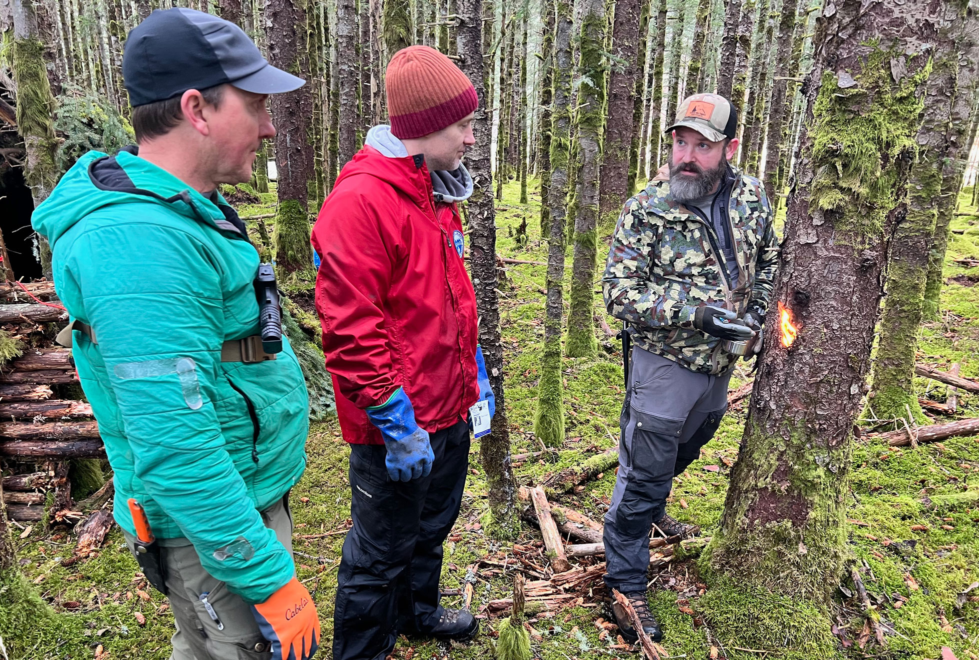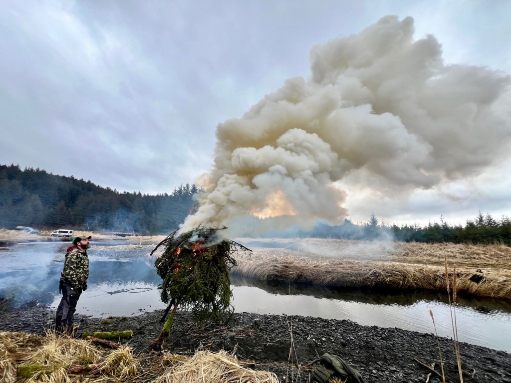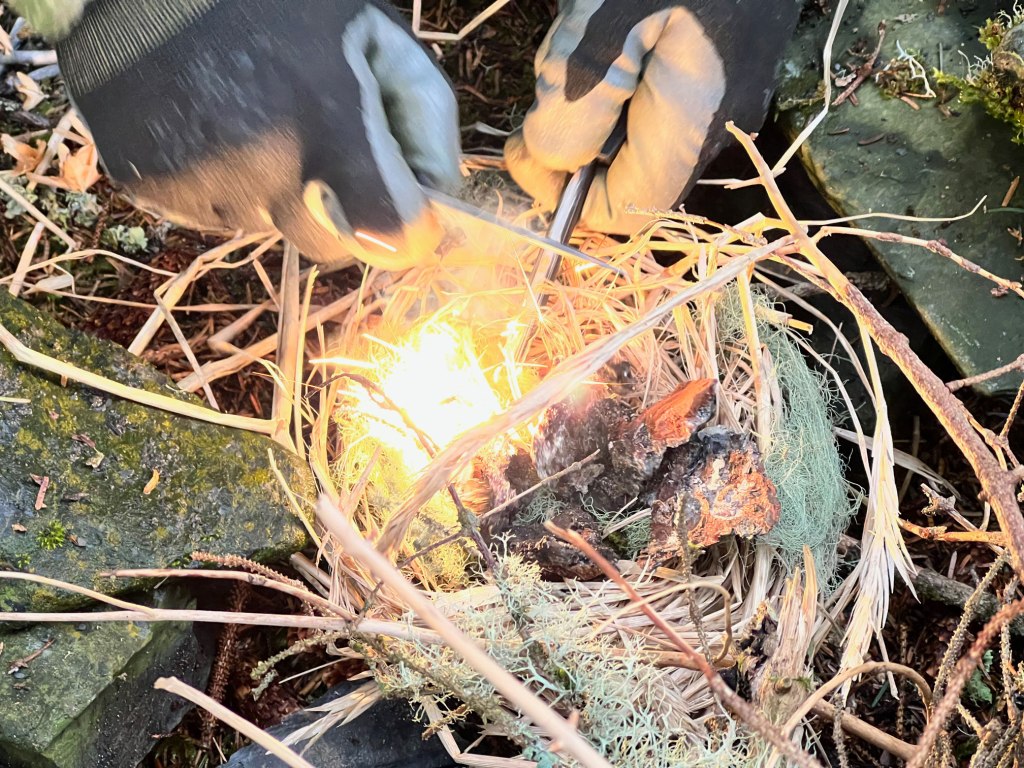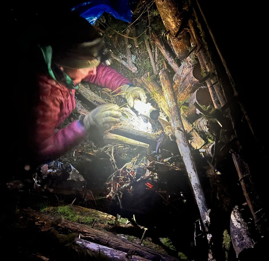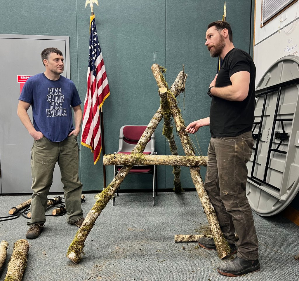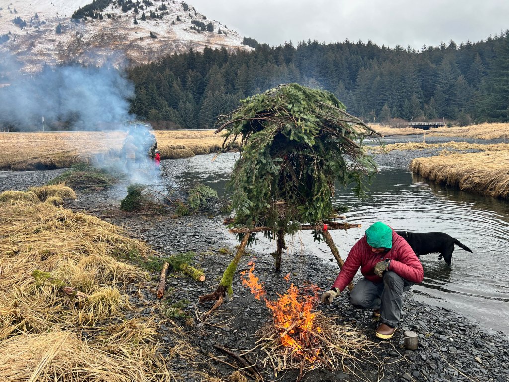 For KISAR’s March training, we partnered with Casey and Bryan of the Kodiak Survival School to work on bushcraft, emergency shelter building, and signaling. It was an intensive 2.5 day course starting with indoor presentations and practical skill building at Bayside Fire Hall on Friday. On Saturday we drove out to White Sands in Monashka Bay and explored different shelter construction techniques starting with minimalist tarps we had brought and then moving up through more robust improvised structures with better weather resistance and longevity. We practiced fire fuel collection on the landscape and worked on our fire starting. KISAR members spent the night in the structure we had constructed with no additional gear than our clothing and a ground cloth, maintaining a small fire through the night for modest warmth. The next day we build ‘smoke generators’ for rapid visual smoke signaling, and then deconstructed the shelters to minimize our impact on the area before heading back to town.