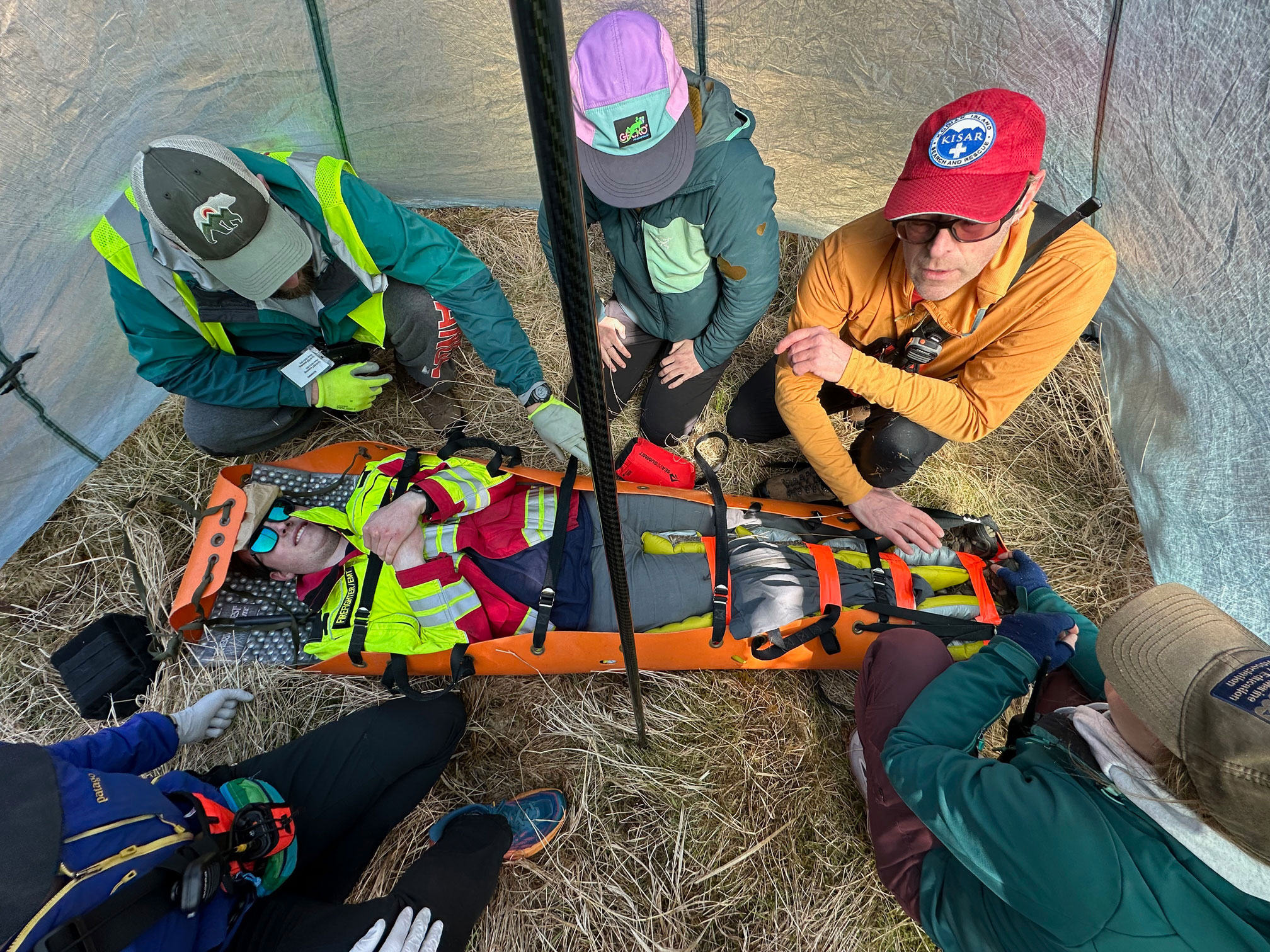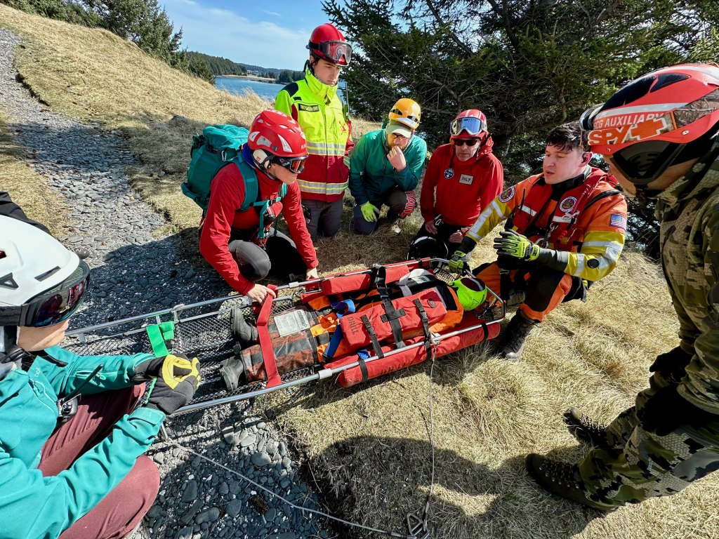 For our April training, KISAR partnered with the USCG Air Station Kodiak to perform a SAR response to a mock bear mauling incident. The scenario was that an individual had been mauled by a bear on the South End trails of Near Island, rendering the subject immobile and unresponsive. KISAR performed a line-abreast visual sweep search until the subject was located, and then developed a patient assessment, treatment, packaging, and evacuation plan. After moving the patient to the south end of Near Island, KISAR members practiced vectoring the responding USCG helicopter to the scene followed by a series of litter hoists.