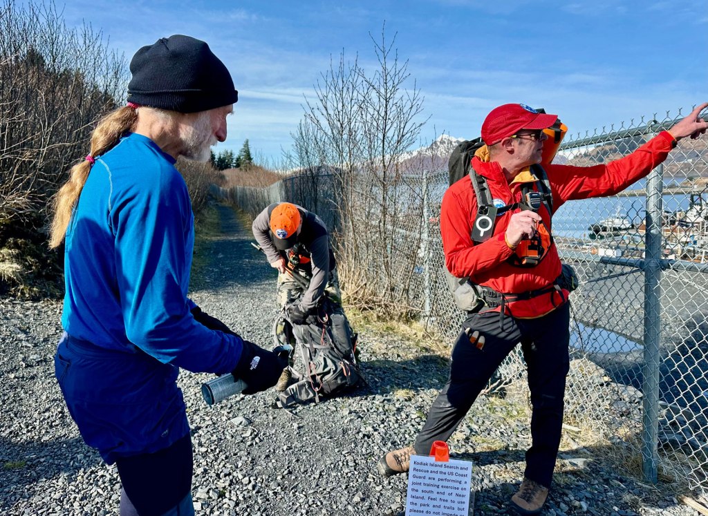 Just as we were starting the search portion of the training, Don Zimmerman came down the trail. He was mauled by a bear on Pillar Mountain in 2020, and in this image Philip is pointing across the channel to the location on Pillar.