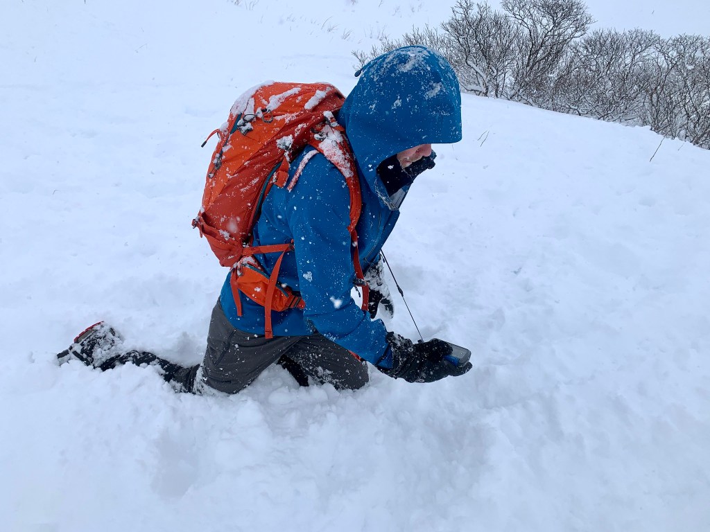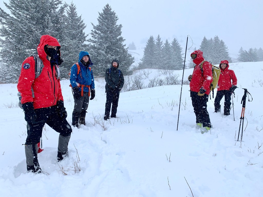 On Saturday Feb 20, KISAR members met at the Pyramid Pass parking area to conduct a field exercise with avalanche transceivers. We ran through a number of demonstrations of how modern transceivers interpret flux lines and how a buried beacon’s physical orientation affects the searcher’s path to the victim. We practiced multiple burial scenarios, demonstrating the transceiver’s mark function. Then we simulated an avalanche accident scene with 2 buried transceivers and had all members practice going through the signal search, coarse search, and fine search for each victim. We practiced probing, and discussed effective digging technique for various burial depths, for a either single rescuer or a group of rescuers. We also performed a probe line demonstration.